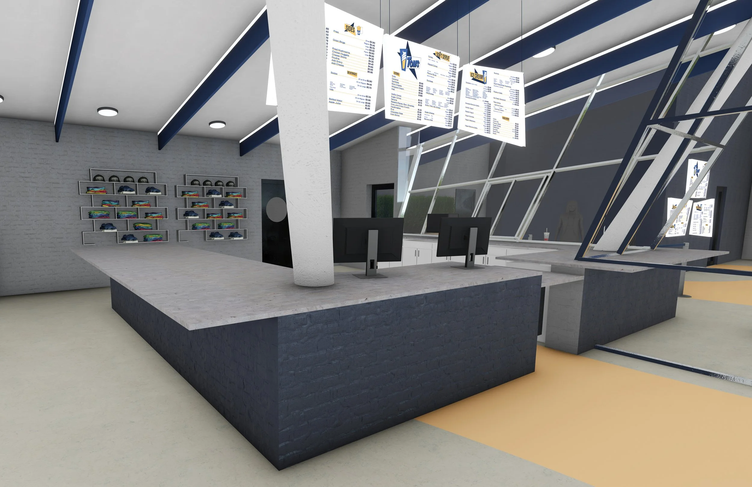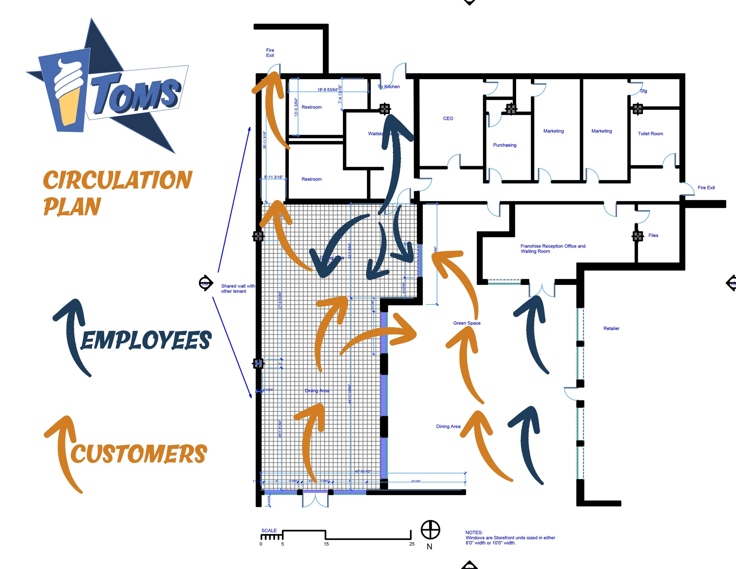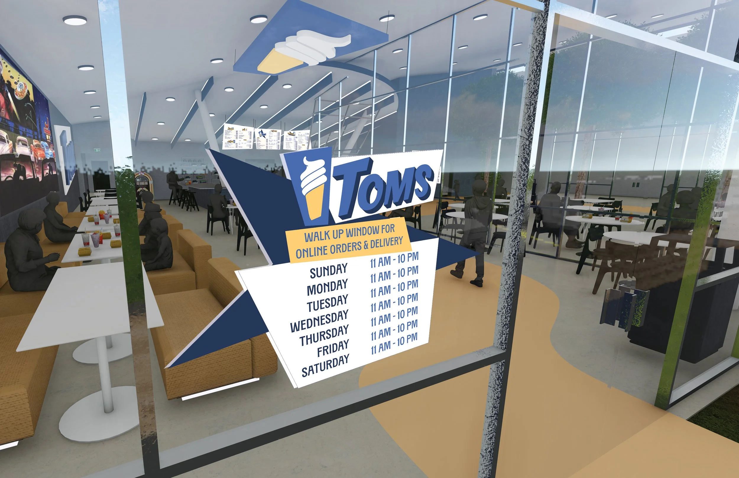 The concept for Toms is to update their current brand and environment that is fresh new yet pays homage to the restaurant’s history. Toms loves the idea of the “diner” look but does not want the cliché diner experience. The intent is to modify the color palette from Toms iconic bright blue and yellow to muted blues and yellows. Providing an indoor dining experience will bring customer traffic year-round while maintaining an outdoor walk-up order window with outdoor seating to enjoy during comfortable weather. The indoor order counter is adjacent to the counter seating area; booths and tables will provide plenty of seating during inclement weather. A hallway leads to the men’s and women’s restrooms. Employees will bring the food and drinks to the tables and will also clear the tables. The overall new branding will give Toms a step up in the dining experience, creating a new and comfortable atmosphere that will be memorable for both locals and tourists.